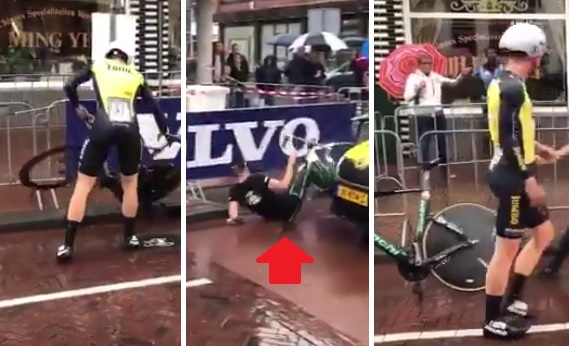 Pobavte se u videa ze včerejší časovky na etapovém závodě BinckBank Tour. Jezdec, který upadl, potřeboval zásah mechanika ze servisního vozu. Místo úspěšné výměny kola se sklouzl po vlhké vozovce a s ním i mechanik.