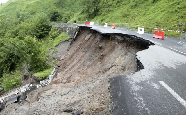 Část silnice ​vedoucí na Col d´Aubisque se po silných deštích sesunula po svahu dolů, trasa jedné z rozhodujících etap dva dny před dojezdem do Paříže je otazníkem.