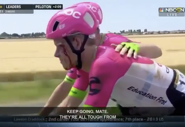 Craddock spadl už v polovině první etapy, kterou dokázal dojet i s roztrženým obočím a zlomenou levou lopatkou. Vzdát se ale odmítl a s bolestmi dokonce nejen přežil včerejší týmovou časovku, ale i výrazně pomohl k výbornému 6. místu amerického týmu. Lídr stáje, Rigoberto Uran, je tak na dostřel nejvyšším příčkám celkového pořadí.