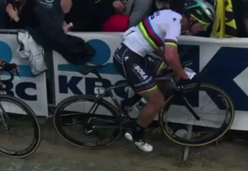 Obhájce loňského titulu Peter Sagan (Bora-Hansgrohe) skončil jako hned několik jeho soupeřů na zemi a v prachu cesty vydlážděné kočičími hlavami zapadla i jeho naděje na druhý triumf v tomto jarním monumentu. Doposud není zcela jasné, co za jeho pádem ve stoupání na Kemmelberg stálo, ale Saganova blízkost bariéry v inkriminovaném momentě incident každopádně umožnila.