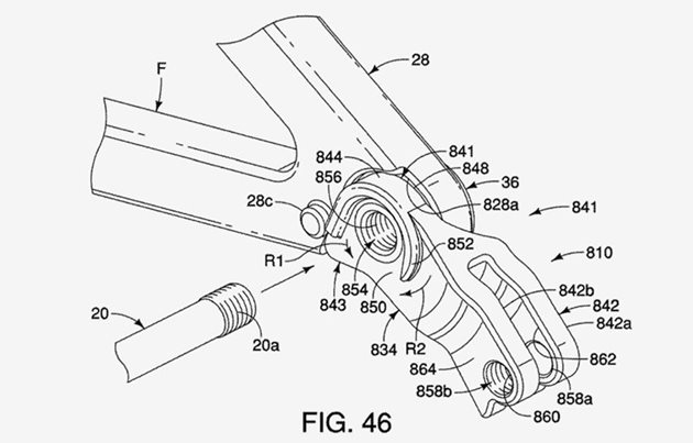 Nový patent totiž ukazuje dvouramenné „vidlicové“ uchycení, které svým principem připomíná řešení SRAMu, jen naopak - tedy inverzní montáž. Přehazovačka se nešroubuje přímo do rámu, ale do průchozího oka patky, kam se fixuje pomocí šroubu.