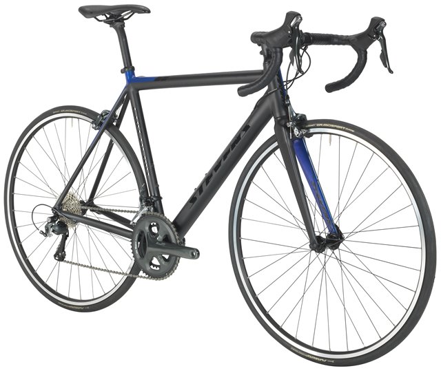 Právě naopak. Elegantní, tuhý a lehký hliníkový rám s třikrát zeslabovanými trubkami kruhového průřezu, karbonová vidlice s taper sloupkem, a kompletní sada Shimano Tiagra 2×10 převodů, to je výbava na úrovni.
