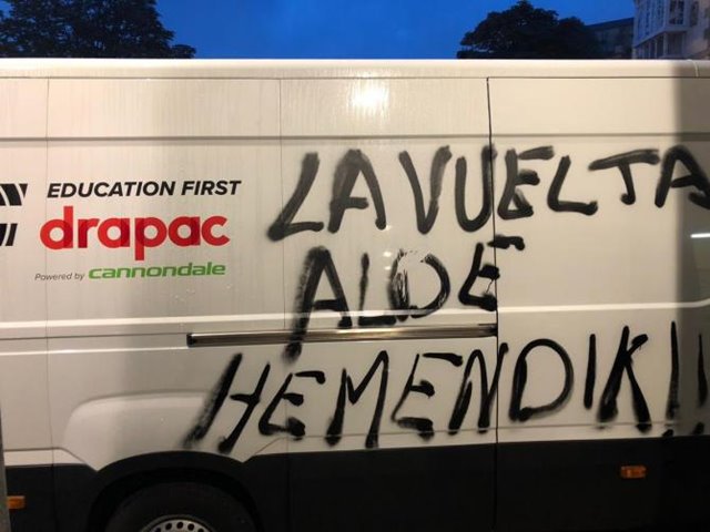 Organizátoři Vuelty od roku 2011 vedou peloton také Baskickem, hrdým a odbojným regionem těšícím se od roku 1979 autonomii od španělské centrální vlády. Po sedmi letech nyní bohužel došlo k prvnímu menšímu incidentu, kdy neznámí vandalové posprejovali auta některých týmů a pořadatelů vzkazem dávajícím najevo, že Vuelta zde není (minimálně pro pár jedinců) vítána.