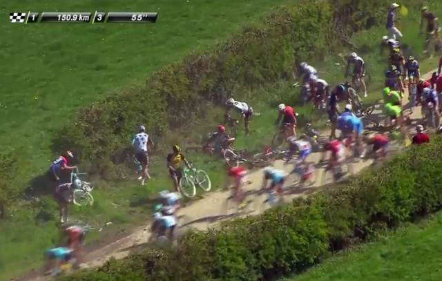 Hromadný pád nastal hned na druhém dlážděném úseku z celkových devětadvaceti.