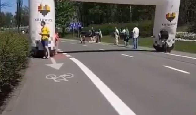 Jednotliví jezdci na amatérských polských závodech jednotně projíždějí nafukovací bránou, jež je se svými nohy typicky umístěna na krajnici. I přes svojí šíři byla nafukovací brána malá a jezdec do ní přímo naboural.