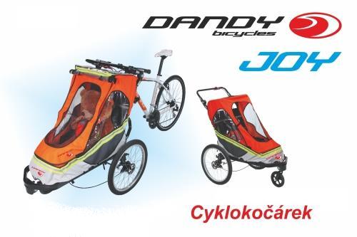 Cyklokočárek DANDY JOY je pevnou a nedílnou součástí jízdního kola, nikoli bicyklu, ale tricyklu! Může být proto provozován na pozemních komunikacích jako kterékoli jízdní kolo, jehož se stává nedílnou součástí. Polovinu tricyklu DANDY JOY už každý máte doma - svoje jízdní kolo! Cyklokočárek DANDY JOY je speciální variantou využití patentovaného multifunkčního vozíku vyžadujícího malé montážní nároky pro připojení k jízdnímu kolu. Tricykl vznikne pevným spojením bicyklu (jízdního kola) a cyklokočárku DANDY JOY, a to po vyjmutí předního kola z vidlice bicyklu a upnutí vidlice a rámu jízdního kola do speciální patentované konstrukce cyklokočárku DANDY JOY umožňující pevné tříbodové spojení při zachování plné řiditelnosti jízdního kola - tricyklu. U cyklokočárku se dále vyklopením vyřadí z provozu přední pasivně řízené kolo. Cyklokočárek nabízí prostorné úložné kapsy pro běžné drobné doplňky potřebné při přepravě dítěte, ale není určen k přepravě nákladů. Cyklokočárek DANDY JOY může být připojen i k jakémukoli elektrokolu, pokud toto není poháněno v náboji předního kola. Více na stránkách www.cyklokocarek.cz