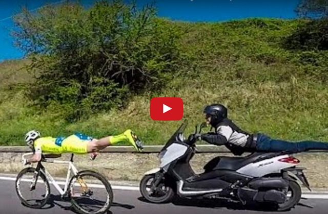 Michael Guerra pokračuje ve skupince jezdců, když si náhle "lehne" na kolo, aby využil maximální aerodynamiky. Pozor, to co ve videu uvidíte je nebezpečné a nedoporučujeme zkoušet na vlastní kůži.